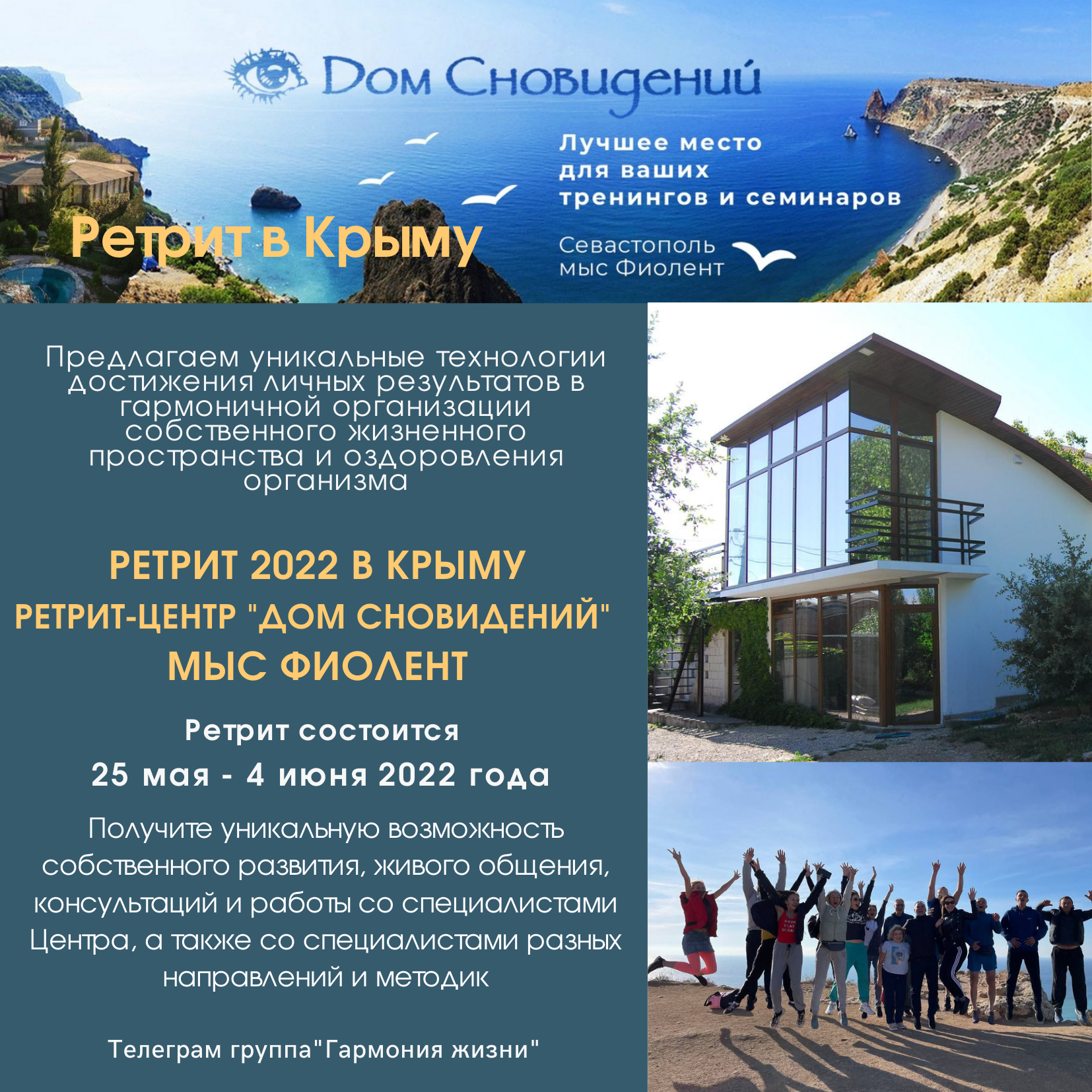 С 7 по 15 октября 2021 года нами был проведен ретрит в Крыму на мысе Фиолент. Сам мыс представляет уникальную площадку по отработке технологий работы с умом и негативными программами. На ретрите были предложены уникальные технологии достижения личных результатов в гармоничной организации собственного жизненного пространства и оздоровления организма. Все без исключения участники вышли на более качественный уровень осознанности и ощущения себя и окружающего пространства. Отзывы участников читайте в разделе "Отзывы..." на нашем сайте.