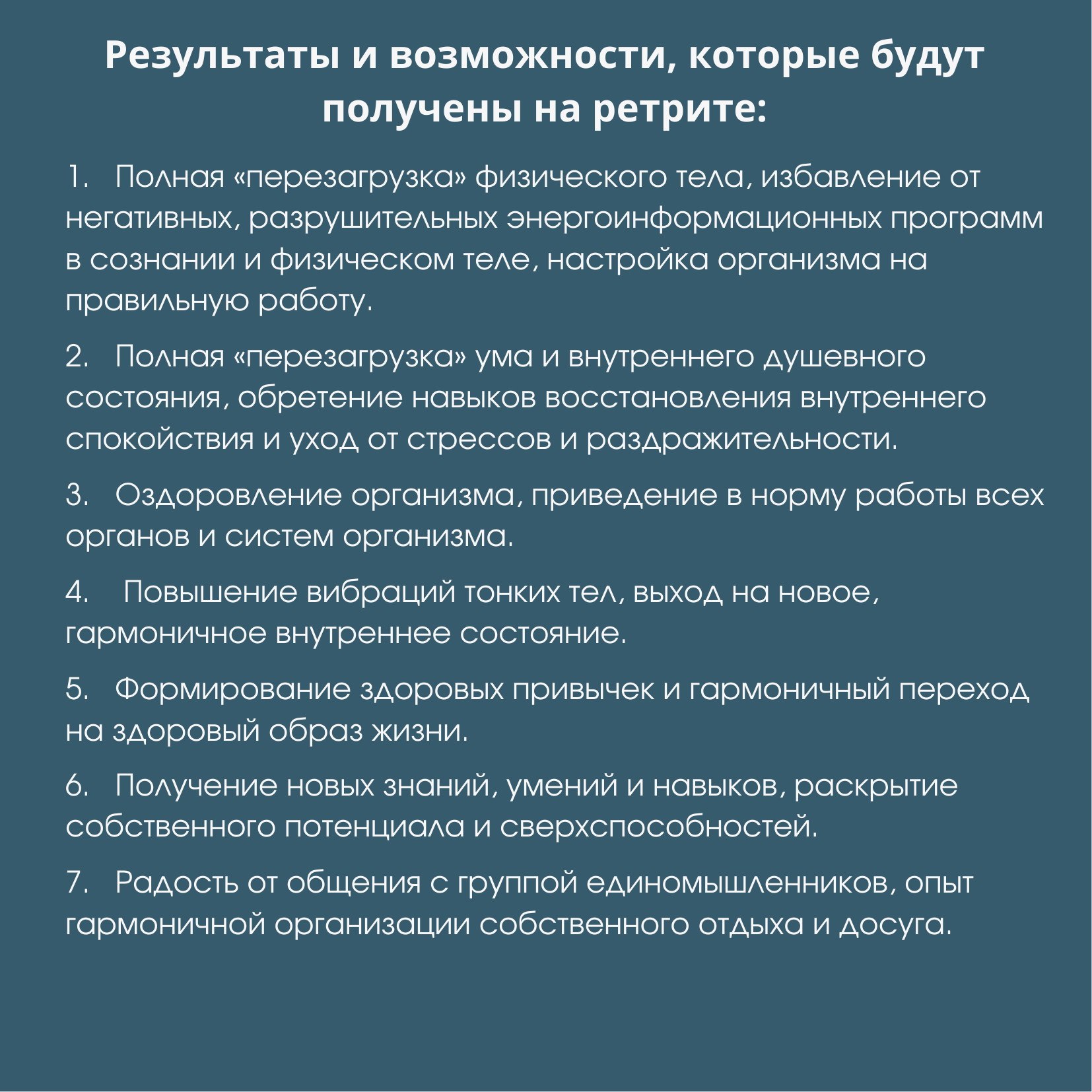 Когда участники ретрита получают уникальную возможность длительное время находиться в гармоничном внутреннем состоянии, глубоко погружаясь в процессы, происходящие как в них самих, так и в окружающем пространстве.