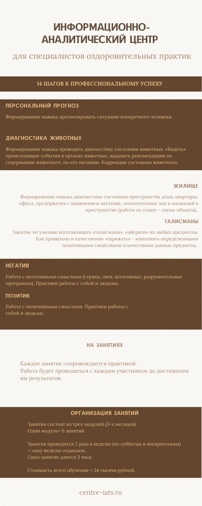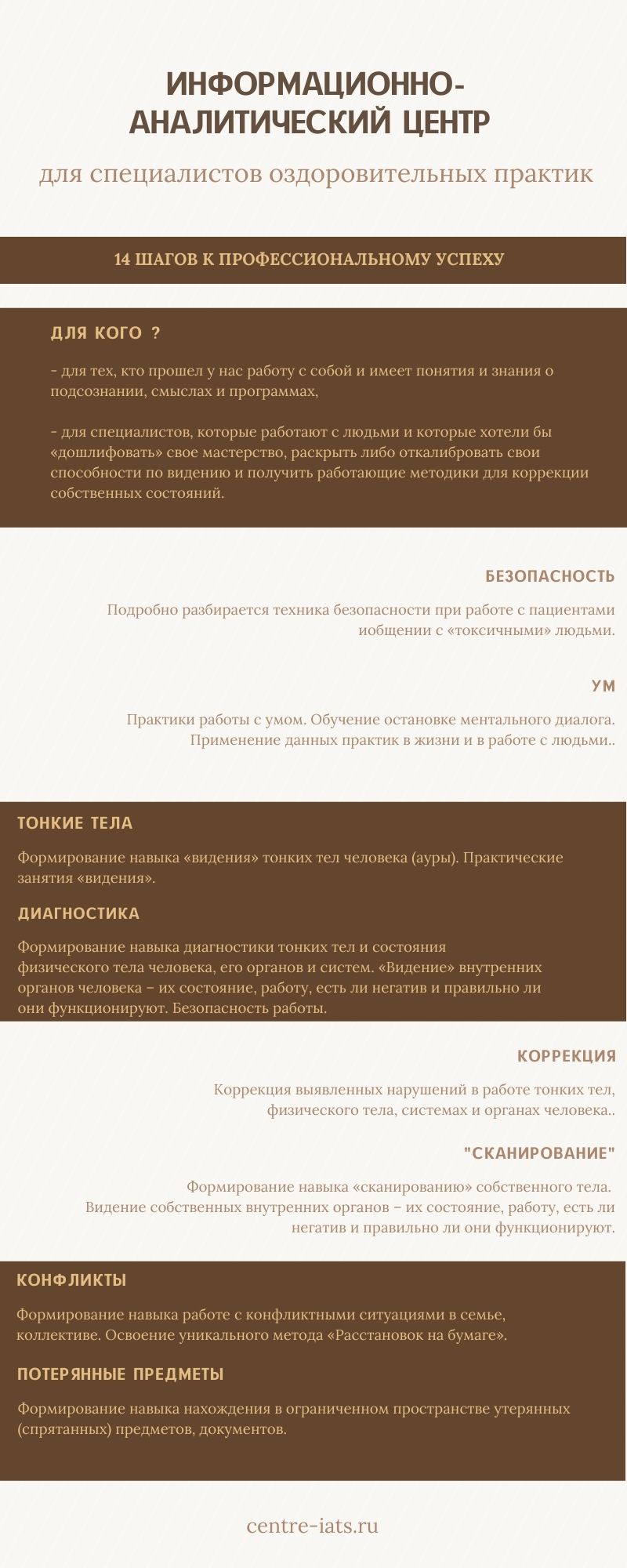 Предлагаем посетить наши семинары, на которых каждый из вас получит: мощные, работающие техники отработки глубинных комплексов негативных программ, записанных в подсознании, которые Вы сможете применять как для работы с собой, так и для работы с другими людьми. В течение всех семинаров будет проводиться практическая работа с каждым человеком из группы, контролируемая Наставником. Каждый участник сам почувствует положительные результаты работы на себе.